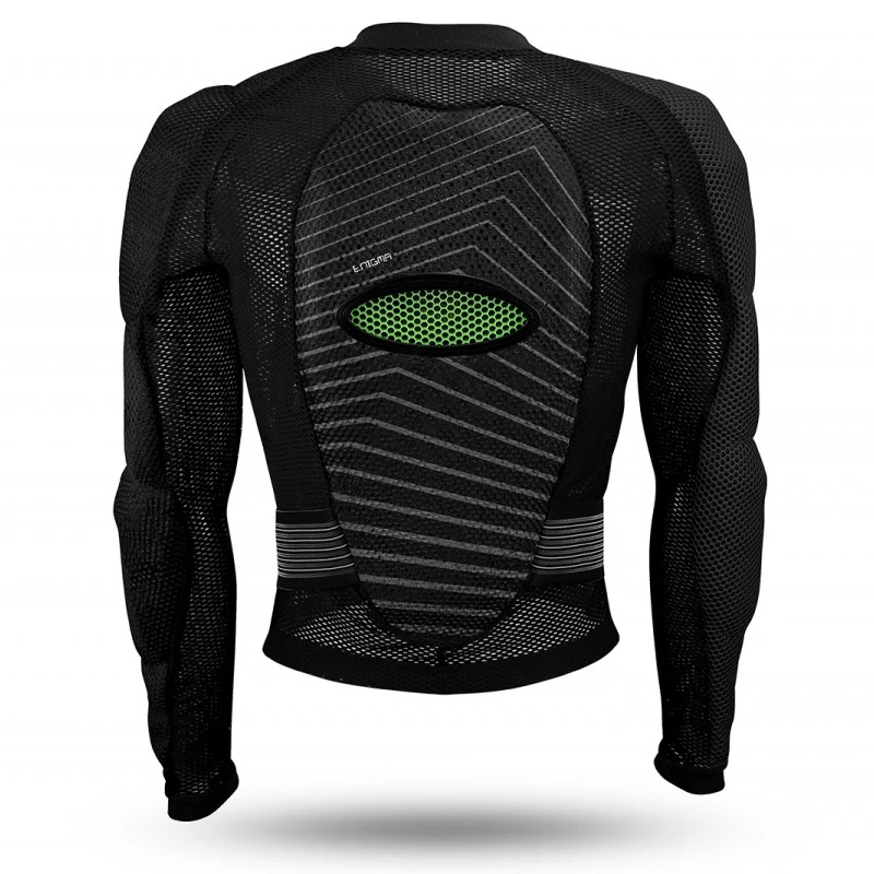 La pettorina ENIGMA è realizzata in Italia completamente con materiali aerati ed è equipaggiata con protezioni interne con la nuova tecnologia ibrida SAS TEC/KOROYD.