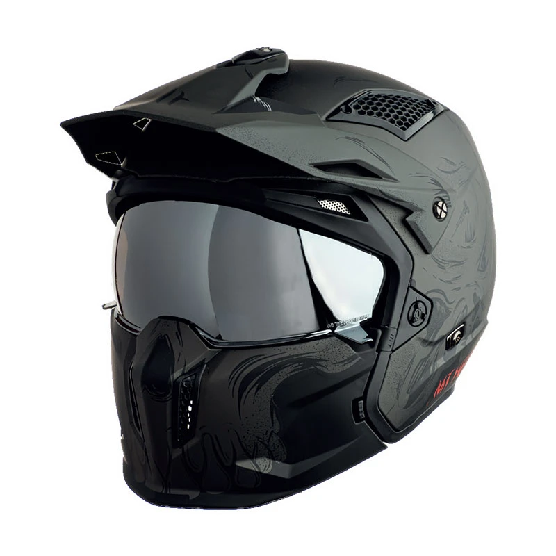 STREETFIGHTER SV è l’importante novità del marchio spagnolo, un nuovo casco jet convertibile molto particolare e innovativo, che richiama nello stile i caschi del passato utilizzati dal mondo del fuoristrada. Tra le caratteristiche principali di questo modello, che lo rendono molto accattivante e davvero versatile nel mondo delle due ruote, la mentoniera removibile e il supporto integrato per il montaggio della sport-camera. Realizzato con calotta esterna in H.I.R.P., composta da polimeri che la rendono estremamente leggera e resistente agli urti. Due le misure, la small e la large, la calotta interna, anch’essa in due misure, è realizzata in EPS a densità differenziata. La visiera a sgancio rapido è antigraffio e anti-UV. Streetfighter è dotato di visierina parasole interna, per una migliore visibilità in condizioni di guida particolarmente soleggiate. Il prodotto include visierino parasole. Gli interni sono estraibili e lavabili, realizzati con tessuti in microfibra traspiranti e anallergici. Il sistema di ventilazione di Streetfighter SV è estremamente funzionale: permette all’aria fresca di entrare attraverso le prese d’aria superiori e di fuoriuscire dall’apposito estrattore posteriore. Un’aerazione perfetta in ogni condizione meteo, anche quella più estrema. Sicurezza e comfort sono garantiti anche dal cinturino con chiusura a sgancio rapido in metallo e regolazione micrometrica. Streetfighter SV è disponibile con diverse varianti grafiche, pronte a soddisfare il gusto dei motociclisti più esigenti e alla moda.