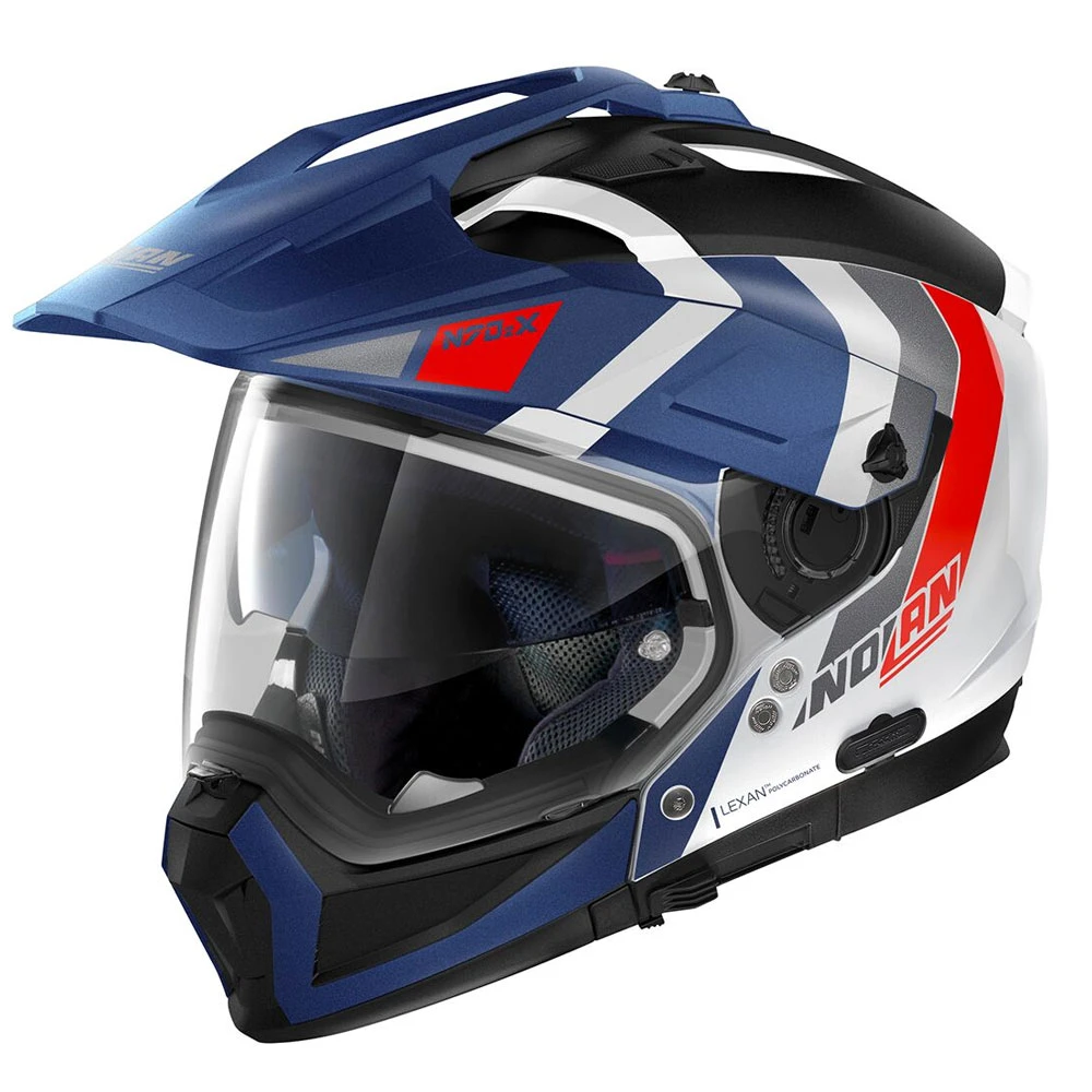 E’ il nuovo crossover da strada e fuori strada top di gamma di Nolan, il primo casco on-off dotato di mentoniera protettiva amovibile sul mercato. Si caratterizza per il design d’ispirazione off-road, le ricche dotazioni tecniche e la buona disponibilità di colori e grafiche. Volume contenuto (grazie alla disponibilità di due misure di calotta esterna), doppia omologazione P/J, visiera ultrawide, oblò particolarmente ampio compatibile con l’uso della maschera (anche a visiera montata e aperta), schermo parasole VPS (regolabile in svariate posizioni e dotato di sistema di richiamo automatico), sistema di ventilazione superiore AirBooster Technology, sistema di ritenzione con regolazione micrometrica a doppia leva Microlock2, innovativa imbottitura interna di conforto Clima Comfort (con tessuti micro-forati e paranuca regolabile) e predisposizione per il sistema di comunicazione N-Com vogliono fare di N70-2 X il crossover da strada e fuori strada di riferimento per il moto-turista più esigente