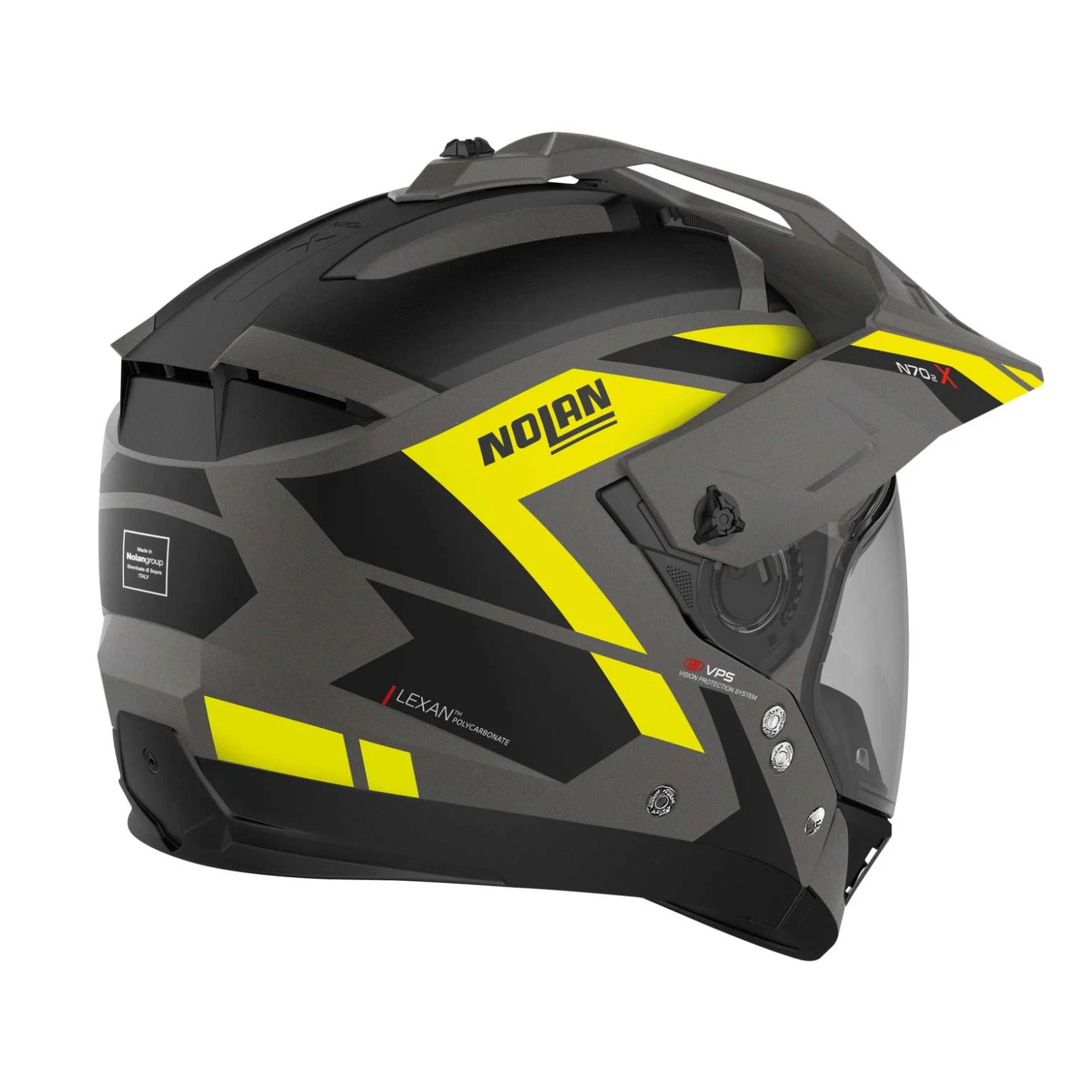 E’ il nuovo crossover da strada e fuori strada top di gamma di Nolan, il primo casco on-off dotato di mentoniera protettiva amovibile sul mercato. Si caratterizza per il design d’ispirazione off-road, le ricche dotazioni tecniche e la buona disponibilità di colori e grafiche. Volume contenuto (grazie alla disponibilità di due misure di calotta esterna), doppia omologazione P/J, visiera ultrawide, oblò particolarmente ampio compatibile con l’uso della maschera (anche a visiera montata e aperta), schermo parasole VPS (regolabile in svariate posizioni e dotato di sistema di richiamo automatico), sistema di ventilazione superiore AirBooster Technology, sistema di ritenzione con regolazione micrometrica a doppia leva Microlock2, innovativa imbottitura interna di conforto Clima Comfort (con tessuti micro-forati e paranuca regolabile) e predisposizione per il sistema di comunicazione N-Com vogliono fare di N70-2 X il crossover da strada e fuori strada di riferimento per il moto-turista più esigente
