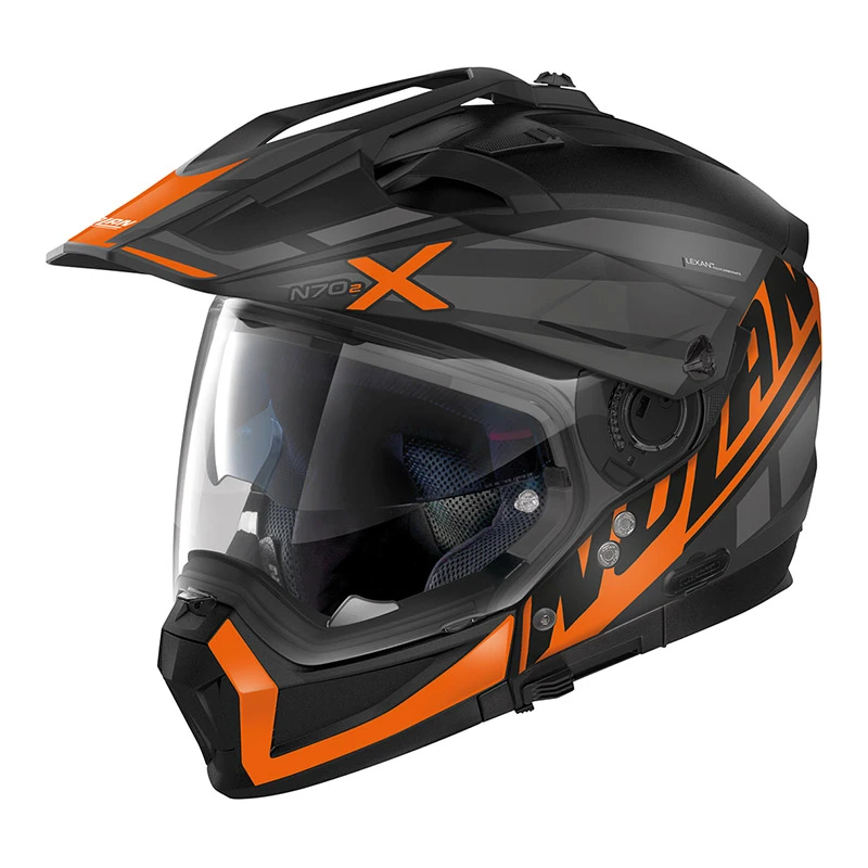 E’ il nuovo crossover da strada e fuori strada top di gamma di Nolan, il primo casco on-off dotato di mentoniera protettiva amovibile sul mercato. Si caratterizza per il design d’ispirazione off-road, le ricche dotazioni tecniche e la buona disponibilità di colori e grafiche. Volume contenuto (grazie alla disponibilità di due misure di calotta esterna), doppia omologazione P/J, visiera ultrawide, oblò particolarmente ampio compatibile con l’uso della maschera (anche a visiera montata e aperta), schermo parasole VPS (regolabile in svariate posizioni e dotato di sistema di richiamo automatico), sistema di ventilazione superiore AirBooster Technology, sistema di ritenzione con regolazione micrometrica a doppia leva Microlock2, innovativa imbottitura interna di conforto Clima Comfort (con tessuti micro-forati e paranuca regolabile) e predisposizione per il sistema di comunicazione N-Com vogliono fare di N70-2 X il crossover da strada e fuori strada di riferimento per il moto-turista più esigente