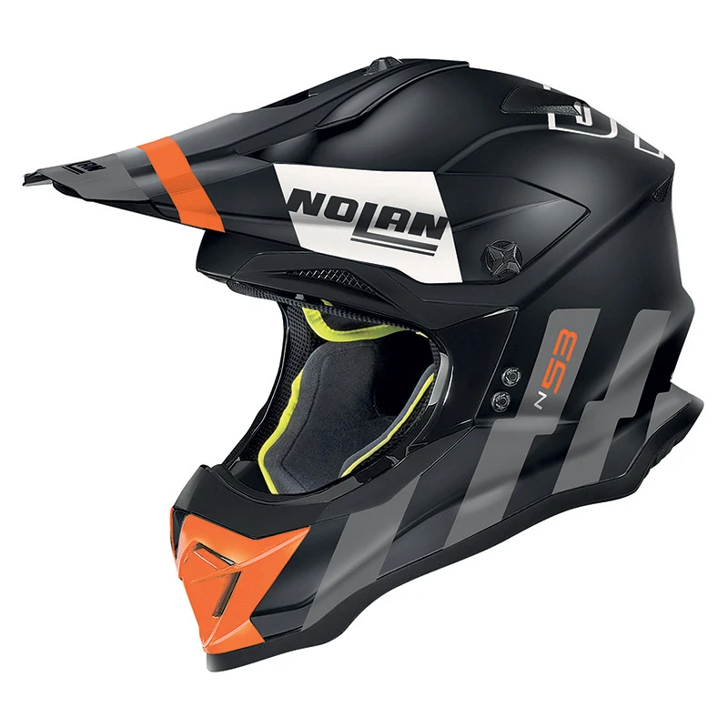 Se siete appassionati di fuoristrada e desiderate regalarvi un nuovo casco, prendete in considerazione il Nolan N53 (cliccate qui per le immagini delle molte grafiche disponibili). Il casco è costruito in policarbonato LEXAN (materiale leggero e resistente) con due calotte disponibili. L’apertura frontale è particolarmente ampia al fine di poter ospitare diversi tipi di occhiali. TESTA CLIMATIZZATA CON L’AIRBOOSTER TECHNOLOGY Tornando alle caratteristiche tecniche, l’interno è realizzato con tessuti colorati che vanntano una elevata traspirabilità e capacità di assorbimento del sudore. L’imbottitura interna è estraibile e lavabile ed è presente un sistema di ventilazione che offre una ampia climatizzazione interna, anche grazie alle numerose prese d’aria ed estrattori presenti del sistema Airbooster Technology. La chiusura è affidata ad un sistema di ritenzione con doppi anelli (DD-ring).