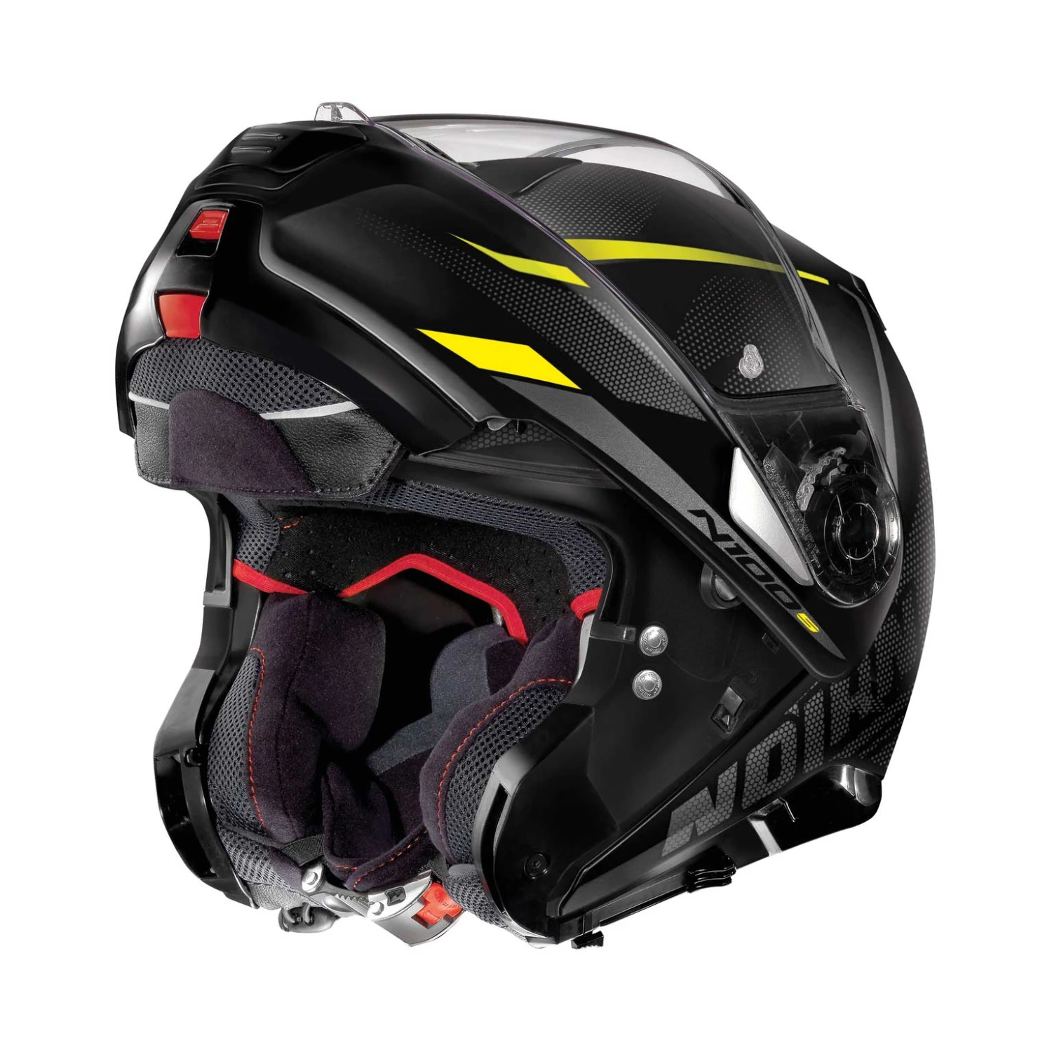 È il nuovo apribile top di gamma Nolan. Si caratterizza per il design elegante, le ricche dotazioni tecniche e l’ampia disponibilità di colori e grafiche. Volume contenuto (grazie alla disponibilità di due misure di calotta esterna), doppia omologazione P/J, visiera ultrawide, schermo parasole VPS (regolabile in svariate posizioni e dotato di sistema di richiamo automatico), sistema di ventilazione superiore AirBooster Technology, movimento di rotazione della mentoniera con traiettoria ellittica, esclusivo sistema di apertura della mentoniera con meccanismo a doppia azione, sistema di ritenzione con regolazione micrometrica a doppia leva Microlock², innovativa imbottitura interna di conforto Clima Comfort (con tessuti micro-forati) e predisposizione per il sistema di comunicazione N-Com vogliono fare di N100-5 uno degli apribili di riferimento per il moto-turista più esigente.