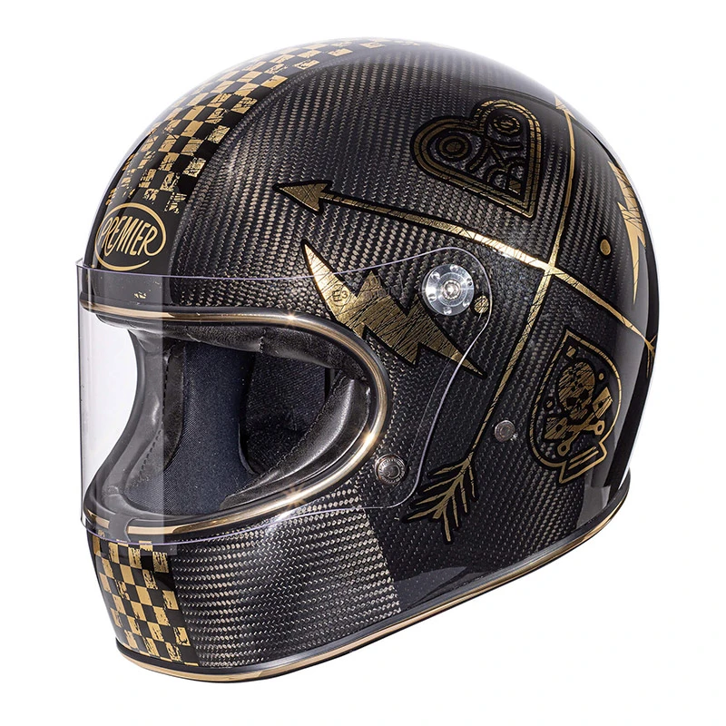Trophy riprende lo stile e le forme dei caschi degli anni 70, ma è conforme ai moderni standard di sicurezza. Ha la calotta esterna stampata in una struttura multi assiale denominata DCA e composta da carbonio, dyneema e fibre aramidiche, amalgamate con resina epossidica. Un mix di fibre leggere e resistenti che contribuiscono a rendere Trophy robusto ma confortevole. La calotta interna è in eps ed è stampata a densità differenziata, per un il miglior assorbimento della forza generata da un impatto. Anche la visiera, pur essendo identica a quelle utilizzate dai campioni del passato, è omologata e dotata del trattamento antigraffio che garantisce sempre un ottima visibilità . Viene fissata alla calotta dal meccanismo che ne regola il movimento e da due bottoni godronati nella parte inferiore. Anche le imbottiture interne sono in perfetta sintonia con lo stile del casco e sono costituite da tessuti antiallergici con trattamento Sanitized con rifiniture in pelle sintetica. Le imbottiture delle guance, anch’esse rifinite in similpelle, sono removibili, mentre il comodo cinturino dispone di chiusura a doppio anello. Come tutti i caschi Premier anche Trophy è omologato secondo la vigente normativa ECE 22-05. Caratteristiche:Calotta: 1. Materiale: Fibra in carabonio e aramidica + resina epossidica. Interni: Guance removibili e lavabili con trattamento sanitized. Visiera: Antigraffio, chiara. Visiera int.: – . Fibbia: Doppio anello. Taglie: da M a XL Peso: 1.200 ± 50gr.