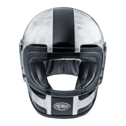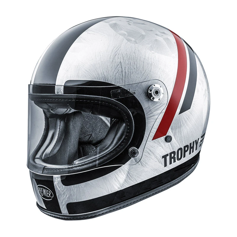 Trophy riprende lo stile e le forme dei caschi degli anni 70, ma è conforme ai moderni standard di sicurezza. Ha la calotta esterna stampata in una struttura multi assiale denominata DCA e composta da carbonio, dyneema e fibre aramidiche, amalgamate con resina epossidica. Un mix di fibre leggere e resistenti che contribuiscono a rendere Trophy robusto ma confortevole. La calotta interna è in eps ed è stampata a densità differenziata, per un il miglior assorbimento della forza generata da un impatto. Anche la visiera, pur essendo identica a quelle utilizzate dai campioni del passato, è omologata e dotata del trattamento antigraffio che garantisce sempre un ottima visibilità . Viene fissata alla calotta dal meccanismo che ne regola il movimento e da due bottoni godronati nella parte inferiore. Anche le imbottiture interne sono in perfetta sintonia con lo stile del casco e sono costituite da tessuti antiallergici con trattamento Sanitized con rifiniture in pelle sintetica. Le imbottiture delle guance, anch’esse rifinite in similpelle, sono removibili, mentre il comodo cinturino dispone di chiusura a doppio anello. Come tutti i caschi Premier anche Trophy è omologato secondo la vigente normativa ECE 22-06. Caratteristiche:Calotta: 1. Materiale: Fibra in carbonio e aramidica + resina epossidica. Interni: Guance removibili e lavabili con trattamento sanitized. Visiera: Antigraffio, chiara. Visiera int.:
